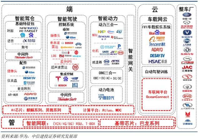 今年5月底,华为正式成立了智能汽车解决方案BU,并表示“华为不会生产汽车,将成为智能汽车的ICT组件供应商”。华为“鸿蒙”系统更是在设计之初就意在将其适用于自动驾驶。7月,华为获得甲级测绘资质,成为我国第20家可以合法制作自动驾驶地图(高精地图)的企业。至此,华为已完成了从解决方案到车载终端、网络平台、芯片、地图的相对完整的智能汽车 产业链 。