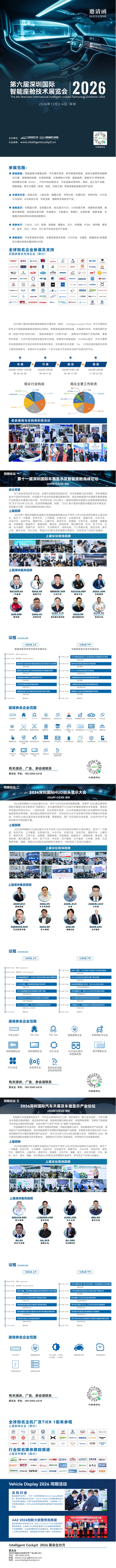 2026第六届深圳国际智能座舱技术展览会(简称: Intelligent cockpit 2026)作为中国领先的专注于智能座舱垂直领域的B2B展会。聚焦智能座舱域控制器、车载操作系统、多模态操作系统(语音/手势/生物识别)、智能表面显示(天幕/车窗)、座舱电子等最新产业链成果,覆盖材料革新、工艺升级与智造设备的前沿突破。同期举办智能座舱、HUD抬头显示、汽车天幕等多场高规格技术交流论坛和专场采购对接会,定向邀约车企高管、Tier 1/2供应链决策层及资深工程师深度参与,为国内外企业提供一个全方位技术交流合作及新产品展示的平台。