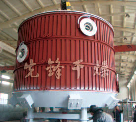 PLG系列盘式连续干燥机盘式干燥机的第一层盘上,带有耙叶的耙臂做回转运动,使耙叶连续地翻转物料,物料沿着指数螺旋线流过干燥盘表面,在小干燥盘上的物料移到外缘,并在外缘落到下方的大干燥盘外缘,在大干燥盘上的物料向里移动并从中间落料落入下一层小干燥盘中,大小干燥盘上下交替排列,物料得以连续地流过整个干燥机,中空的干燥盘内通入加热介质,加热介质从一端进入另一端导出,已干燥物料从最后一层干燥盘落到壳体底层,最后被耙叶移动到料口排出。蒸发出来的水蒸汽由设置在顶部的排湿口排出,夹带的粉尘由脉冲除尘器回收,尾气由排湿风机排出室外。底部排出的干物料可直接包装。