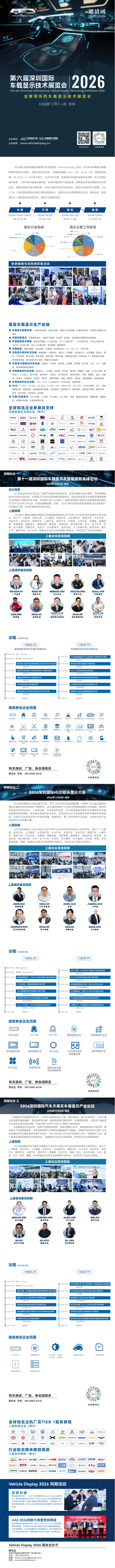 2026第六届深圳国际车载显示技术展览会(Vehicle Display 2026)作为全球车载显示垂直领域的领先B2B展会,持续引领行业风向。本届展会聚焦 Mini LED、Micro LED 深度应用拓展,AR-HUD、P-HUD技术迭代,以及汽车天幕、车窗显示等创新领域前沿成果,全方位展示材料革新、工艺升级与智造设备突破,呈现车载显示产业链全景。同期举办多场高规格技术交流论坛,涵盖车载显示各关键领域,还精心组织专场采购对接会,精准定向邀约车企高管、Tier 1/Tier 2 供应链决策层及资深工程师深度参与,为国内外企业搭建集技术交流、商务合作、新品展示于一体的综合性高端平台,推动产业蓬勃发展。