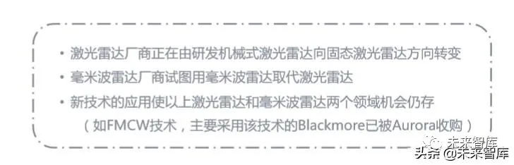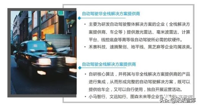 就资本层面而言,由于技术发展不及预期,2018年下半年之后,资本对高等级 自动驾驶的热情普遍降低,在这类开放道路自动驾驶企业身上体现得尤为明显。就企业自身而言,商业化时间过长,导致其此前几乎都是凭借大额融资维持运营, 但目前单纯靠逐渐冷静下来的资本“输血”变得越来越困难。未来三年,“活下 去”成为这类企业重要的目标。为实现此目标,未来企业或会在研发开放道路自动驾驶的同时,探索更多商业化 路径,“多条腿走路”或转型以先实现自我供血。2.2 趋势二:更多自动驾驶非全栈解决方案提供商迎来发展机会在自动驾驶技术发展过程中,其全栈解决方案提供商率先出现,美国的Waymo 和中国的百度是该领域两大代表企业。经过近几年技术迭代,自动驾驶产业链逐渐由粗放式向精细式方向发展,自动驾 驶非全栈解决方案提供商陆续出现,诸多关键技术模块也取得突破。从产业链构成来看,目前自动驾驶执行层基本被国际Tier 1供应商垄断,他们 拥有体系化的底盘控制系统,及与主机厂的深度绑定关系,因而很难有初创企 业能够位列其中。感知层和决策层零组件供应链分散,企业类型丰富,初创企业相对容易切入, 自动驾驶非全栈解决方案提供商主要集中于此。