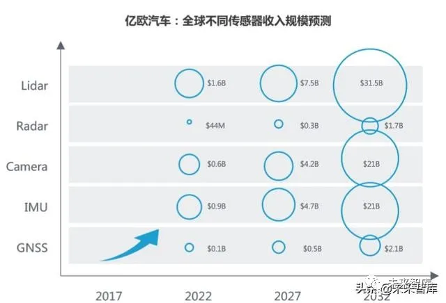 即便玩家众多,但环境感知领域广阔的市场前景仍将吸引更多新企业加入。据法国行业研究公司Yole测算,未来数年,传感器收入规模将进入高速发展期。其中,激光雷达、IMU、摄像头排名前三。