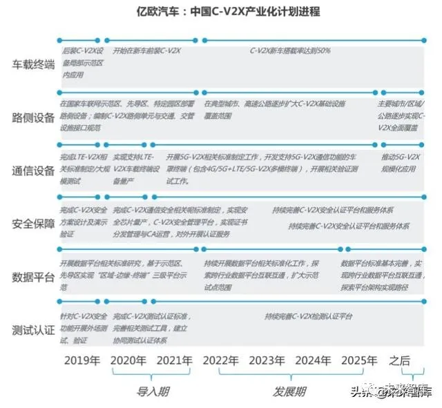 对于园区、矿区等封闭环境自动驾驶而言,其区域固定且面积不大,路端设备 相对好部署,自动驾驶汽车的行驶路线也可以进行提前规划,实现难度相对较 低。目前已有多家企业初步实现试点应用。我们认为,该场景可在3年内扩大应用范围,逐渐转向常态化。但对车辆编队驾驶、停车场自主泊车、L5级自动驾驶而言,由于大多为乘用车, 且相关法规层面的缺失,未来3年内或会进行示范应用,但暂时不会投入运营。2.6.2 车路协同的主要工作仍将主要集中在基础建设方面2016年起,我国各地开始建设智能网联示范区,并有意识地增加示范区路侧设 备的部署,供自动驾驶汽车路测及探索车路协同技术。目前,国家层面正大力进行基础设施建设。2020年3月,工信部发布《关于推动 5G加快发展的通知》,提出要促进“5G+车联网”协同发展,明确将车联网纳 入国家新型信息基础设施建设工程,促进LTE-V2X规模部署。但基础设施的改造是一项长期的系统性工程,其不仅需要汽车、通信、科技等多 类企业与政府不同部门之间合理配合,还需要投入大量资金。以高速公路为例, 保守假设每公里高速公路的智能化改造费用为100万元,以2019年我国14.26万 公里的高速公路来测算,总体需投入1426亿元经费,更不必说目前我国已近500 万公里的公路里程。此外,铺设完成后,后期设备的升级与维护也是一大挑战。因此,即便政府在4年前就已开始基础设施的建设改造,但根据中国智能网联汽 车产业创新联盟(CAICV)、IMT-2020(5G)推进组C-V2X工作组、中国智能 交通产业联盟(C-ITS)、中国智慧交通管理产业联盟(CTMA)联合发布的 《C-V2X产业化路径和时间表研究》白皮书,2020年仍被认为是C-V2X产业化 的“导入期”,此后在经历4年的“发展期”后,才能进入“高速发展期”。从这个角度来看,未来三年,车路协同的主要工作仍将集中在基础建设层面,并 将配合基础设施建设开展小范围应用试点。