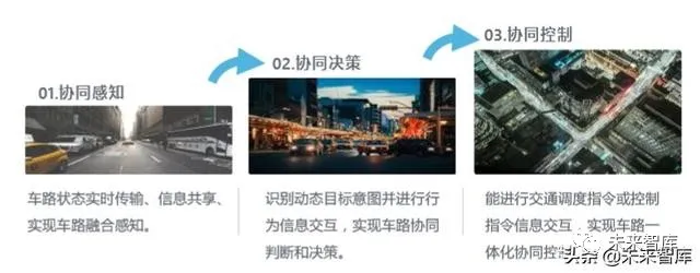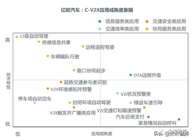 以往,单车智能的打造与智慧道路的建设均是由相关单位从单个环节入手,独自 进行研发,呈“割裂”态势,车路协同能有效将二者结合在一起,不仅有助于高 等级自动驾驶的实现,也符合我国交通强国的大方向。在政府和企业的联合推动下,车路协同在近几年得到快速发展。2018年11月 中国汽车工程学会年会暨展览会(SAECCE)期间,华为、大唐、高通、金溢科 技、 星云互联、东软睿驰、上汽、长安、北汽、吉利等多家企业联合展示了世 界首例“跨通信模组、跨终端、跨整车”的互联互通,成为推动我国C-V2X大规 模应用部署和产业生态体系构建的重要一步。l 从路侧建设进度来看,各地政府大多都已建立智能网联示范区,并着手改造 示范区道路,部署车路协同路侧设备。由于投资大、进程慢,未来三年,路 侧建设还将持续。l 从应用类型来看,目前车路协同技术有智慧路口、智慧矿山、自动代客泊车、 高速公路车辆编队行驶四个典型应用场景。在各路玩家的努力下,车路协同 将率先在以上场景中实现应用。综合考虑技术和法律因素,我们认为, 未来三年,智慧路口和智慧矿山将成为与车路协同技术的落地场景。l 从配套技术来看,由于高等级自动驾驶技术离成熟期较远,未来三年,车路 协同与自动驾驶的结合应用,还将在智能网联示范区或特性路段小范围进行。作为更多依靠基础设施建设的技术,车路协同的大爆发还需等待自动驾驶技 术的进一步成熟。2.6.1 部分基于车路协同的自动驾驶场景将率先实现应用根据技术特性和应用成熟度两个维度,中国信息通信研究院将C-V2X支持实现的 车联网应用大致分为四个象限。其中,技术特性指该应用从测试试验验证样品到 可量产产品之间还存在较大技术难度;应用成熟度指产业链、运用模式、管理制 度和商业模式的成熟程度。
