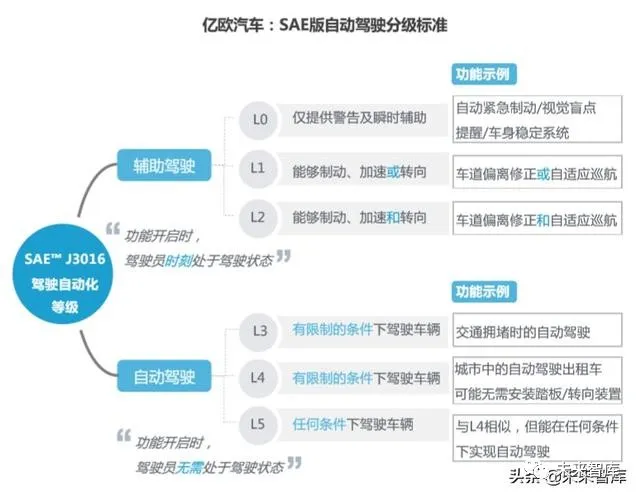 通过三大关键系统的协同运作,汽车能够实现自主行驶。与人类驾驶员相比,自动驾驶汽车具有安全、便利、省时三个特点。l 安全:对周围环境感知更加精准而全面,以此做出正确判断。l 便利:解放人类的双眼、双手、双脚,及大脑,使车变为“第三生活空间”。l 省时:分析各类数据,规划优行车线, 避免交通拥堵。目前业界主要采用的自动驾驶分级标准是由SAE International(国际汽车工 程学会)2014年发布,2018年修订的《标准道路机动车驾驶自动化系统分类 与定义》:根据系统执行动态驾驶任务的多少,将自动驾驶分为L0-L5级六种 不同级别。