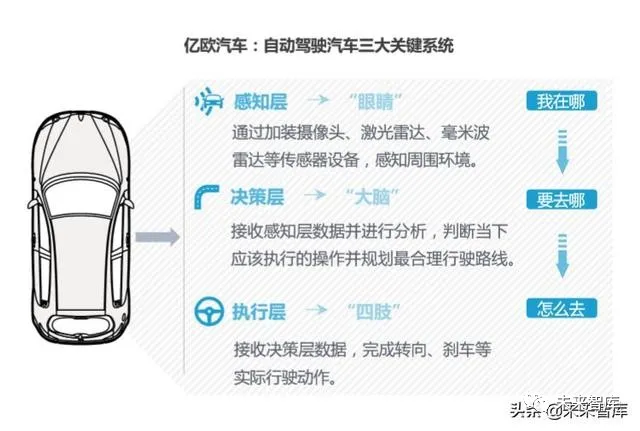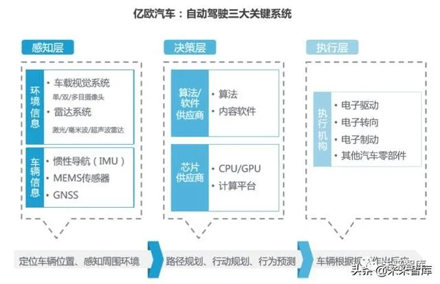 此时,惯性导航系统IMU作用凸显。其测量方法不依赖外界,在GNSS信号丢失 的情况下,车辆依旧能够准确定位,稳定高频输出信号,短期精度较高。基于此,以GNSS+IMU的高精度定位传感器为基础,综合考虑周围环境特征的 方案将越来越受欢迎。2019年,千寻位置、戴世智能、导远科技等定位服务提供商均完成新一轮融资。未来,各家自动驾驶公司对高精度定位模块的需求将向趋同化发展。我们认 为,该领域存在诸多发展机会。总体而言,感知层在过去几年吸引了业界诸多关注。但当感知层性能提高的同时, 其后的决策层和执行层也愈发受到关注。业界正在思考:车辆如何在感知正确性 未达到100%情况下,做出准确规划?从技术角度而言,自动驾驶决策层和执行层仍有诸多难题等待企业解决。但从新机会角度来看,执行层多被国际Tier 1所把控,初创企业很难切入,而决 策层与场景息息相关,企业也较难将其单独拆分提供标准化产品。尤其决策层,需要大量数据做行为预测与规划,不断训练自己的模型。因此未来 计算平台、场景测试、仿真平台等与数据相关的诸多细分领域,都将产生发展机 会。2.3 趋势三:车企更注重方案量产可能性, 未来致力于实现部分L3级自动驾驶技术量产面对自动驾驶技术,车企经历了从不信任到逐步重视的心理过程,直到目前市面 上各大主流车企都在该领域有所布局。l 不感兴趣:2014年-2015年,百度成立自动驾驶事业部,开始研发自动驾驶 技术。由于企业基因不同,拥有百年发展历史的车企对科技公司的业务并不 感兴趣,此时发布的战略多与智能网联有关。l 重新审视:2016年-2017年,上汽在其前瞻技术论坛上,提出“电动化、智 能化、网联化、共享化”的新四化布局,这遂即成为各家车企追求的目标。与此同时,小马智行、主线科技、禾多科技等一众自动驾驶公司诞生,车企 开始重新审视并对这项代表未来的新技术进行跟进。l 制定战略:在奥迪2017年发布全球第一款量产的L3级自动驾驶汽车新款A8后, 北汽、上汽、长安等国内主流车企陆续公布更加聚焦于自动驾驶领域的战略规划。