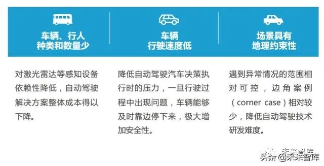 虽然停车场也属于限定场景,但该区域内车辆类型以乘用车为主,与个人生命安 全联系更为紧密,且国内法规暂未给予自动驾驶汽车在停车场内行驶的路权。