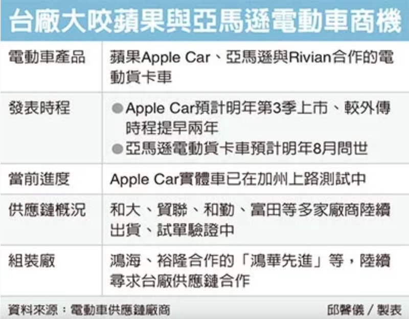 昨天,台湾经济日报称苹果最近向和大、贸联、和勤、富田等台湾汽车零部件厂商提出了备货要求,苹果预计将会在明年9月发表苹果汽车,还称其原型车已经在美国加州上路测试。