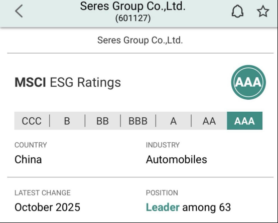 10月16日,国际权威指数公司明晟(MSCI) 公布最新企业ESG评级结果,赛力斯集团获得最高AAA评级,成为唯一获此评级的A股上市汽车企业。此次评级成绩充分印证了赛力斯在ESG治理与可持续发展领域的领先实力,更彰显了中国汽车品牌在推动全球产业绿色转型中的引领力量。