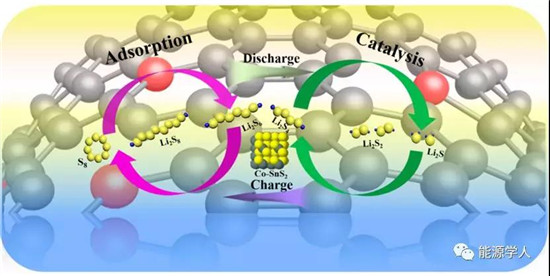 图4 S/NCNT@Co-SnS2电极上充电/放电过程的示意图,包括化学吸附和催化转化作用。