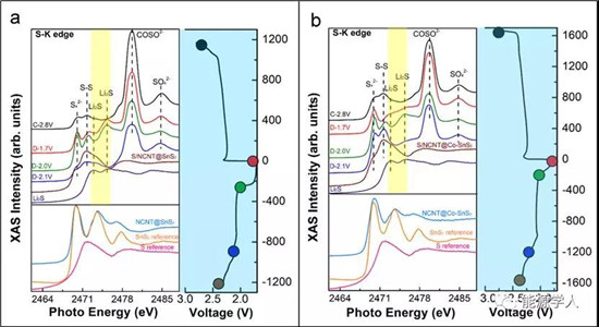 图3XANES用于NCNT@Co-SnS2和NCNT@SnS2充放电过程中多硫化物转换过程研究。