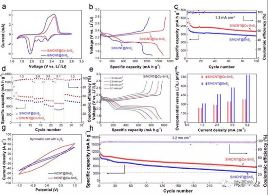 图2NCNT@Co-SnS2和NCNT@SnS2的电化学性能图。(a)CV;(b)1.3mA/cm2电流密度下的充放电曲线;(c)1.3mA/cm-2电流密度下的循环性能;(d)倍率性能;(e)不同倍率下的充放电曲线;(f)不同倍率下的过电势;(g)Li2S6-Li2S6对称电池CV图;(h)3.2mA/cm2电流密度下的长寿命循环。
