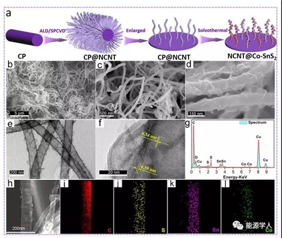 图1 (a)NCNT@Co-SnS2电极合成示意图;(b-d)NCNT@Co-SnS2的SEM图;(e-f)NCNT@Co-SnS2的TEM;(g)EDX图;(h-l)原始TEM图及C,S,Sn,Co元素分布图。